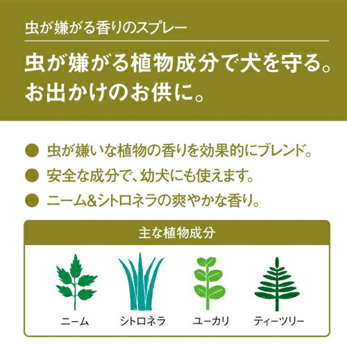 特徴 ・虫が嫌いな香りの植物成分(ニームエキス、シトロネラ、ユーカリ、ティーツリー、ペニーロイヤル)を配合することで、防虫効果を発揮します ・犬が舐めても安全な成分でできています ・サンスクリーン成分により日焼けによる毛色の退色を防ぎます 内容量 125ml 成分 ニームエキス、シトロネラオイル、ユーカリオイル、ティーツリーオイル、ペニーロイヤルオイル、マカデミアナッツオイル、レモン香料、バニリン、エタノール、紫外線防止成分、保存料 など 使用方法 お散歩前に、犬の体全体にまんべんなくスプレーしなじませて下さい。