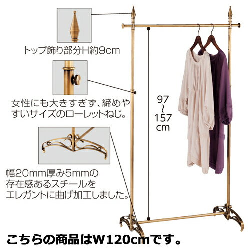 商品の仕様●サイズ:W120×D46×H124.5〜184.5cm●バー内寸:W102.5cm ハンガーパイプ:φ19mm 外パイプ:φ22mm●素材・加工:スチール製 アンティークゴールドメッキ●重量:8.3kg●耐荷重:30kg●組立式●10cm間隔で7段階の高さ調節ができます。