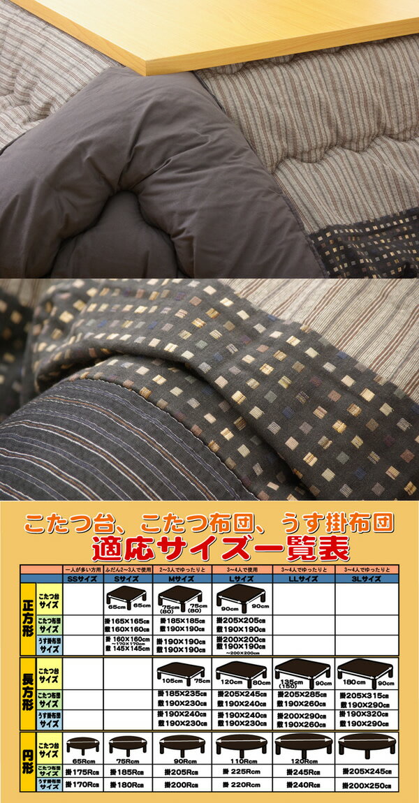 90×210cm幅のこたつ台に適応素材:掛け=表地)綿100%【しじら】 裏地)ポリエステル100% 中材)ポリエステル100% 3.6kg 敷き=表地)綿100%【しじら】 裏地)不織布 中材)ポリエステル0.8kg+ウレタンフォーム■梱包サイズ:W50xD70xH70cm / 9.4kg ※商品画像には同シリーズの他サイズを使用している場合もございます。
