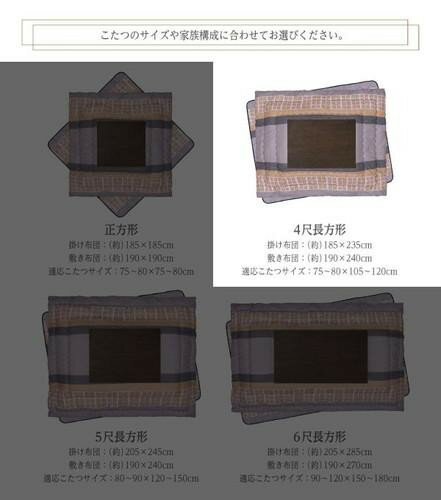 【商品名】レトロ調幾何柄こたつ布団【サイズ】 ・正方形 掛け布団:(約)185 185cm敷き布団:(約)190 190cm適応こたつサイズ:75〜80 75〜80cm・4尺長方形掛け布団:(約)185 235cm敷き布団:(約)190 240cm適応こたつサイズ:75〜80 105〜120cm・5尺長方形 掛け布団:(約)205 245cm敷き布団:(約)190 240cm適応こたつサイズ:80〜90 120〜150cm・6尺長方形掛け布団:(約)205 285cm敷き布団:(約)190 270cm適応こたつサイズ:90〜120 150〜180cm【生地】[掛け布団] 表地:ポリエステル 100%裏地:ポリエステル 100%詰め物:ポリエステル 100%[敷き布団]表地:ポリエステル 100%裏地:ポリプロピレン 100%詰め物:ポリエステル 100%【生産国】側地加工:中国、製品加工:日本【注意事項】※サイズは概算です。