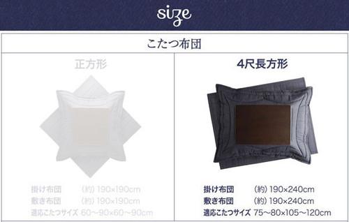 《こたつ用掛け布団》〈サイズ〉正方形:190 190cm(適応こたつサイズ 60〜90 60〜90cm)4尺長方形:190 240cm(適応こたつサイズ 75〜80 105〜120cm)〈生地〉表地:綿100% デニム調裏地:ポリエステル100%中綿:ポリエステル100%〈生産国〉中国------------------------《こたつ用敷き布団》〈サイズ〉正方形:190 190cm14尺長方形:90 240cm〈生地〉表地:ポリエステル100% 裏地:ポリエステル100%詰め物:ポリエステル100%〈生産国〉中国------------------------《クッション(無地)》〈サイズ〉50 50cm〈生地〉表地・裏地:ポリエステル100%詰め物:ポリエステル100%〈生産国〉中国------------------------《クッション(ストライプ)》〈サイズ〉直径55cm〈生地〉表地・裏地:綿100%詰め物:綿50%、ポリエステル100%〈生産国〉日本------------------------《ごろ寝マット(無地)》〈サイズ〉約40 120cm〈生地〉表地・裏地:ポリエステル100%詰め物:ポリエステル100%〈生産国〉中国------------------------《ごろ寝マット(ストライプ)》〈サイズ〉約43 120cm〈生地〉表地・裏地:綿100%詰め物:ポリエステル100%〈生産国〉日本------------------------《ビッグクッション》〈サイズ〉直径約95cm〈生地〉表地・裏地:綿100%詰め物:ポリエステル100%〈生産国〉中国注意情報※サイズは概算です。