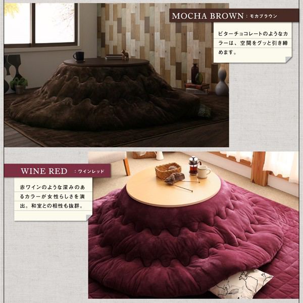 【サイズ】 *直径205cm 掛け布団:(約)直径205cm敷き布団:(約)190 190cm適応こたつ机天板サイズ:直径約75〜90cm前後*直径225cm掛け布団:(約)直径225cm敷き布団:(約)190 190cm適応こたつ机天板サイズ:直径約100〜120cm前後【生地】掛け布団:(表地・中わた・裏地)ポリエステル100%敷き布団:(表地・中わた・裏地)ポリエステル100%【生産国】中国【注意事項】※サイズは概算です。